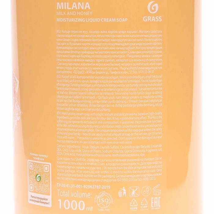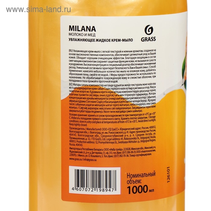 Жидкое крем-мыло Grass Milana "Молоко и мед", 1 л