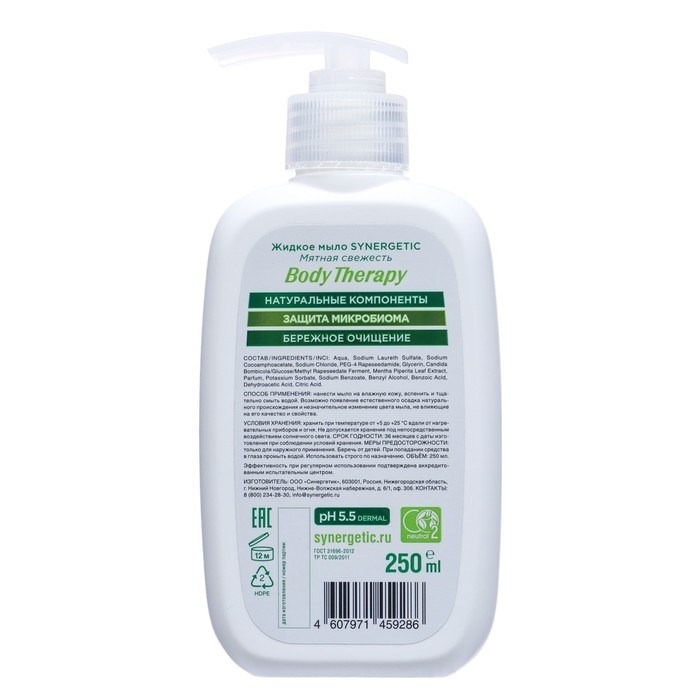Жидкое мыло SYNERGETIC «Мятная свежесть» BODY THERAPY мягко и деликатно очищает кожу и поддерживает ее естественный рН-баланс. Жидкое мыло на основе натуральных компонентов обеспечивает бережное очищение, длительный смягчающий эффект и поддержание гидролипидного баланса кожи.