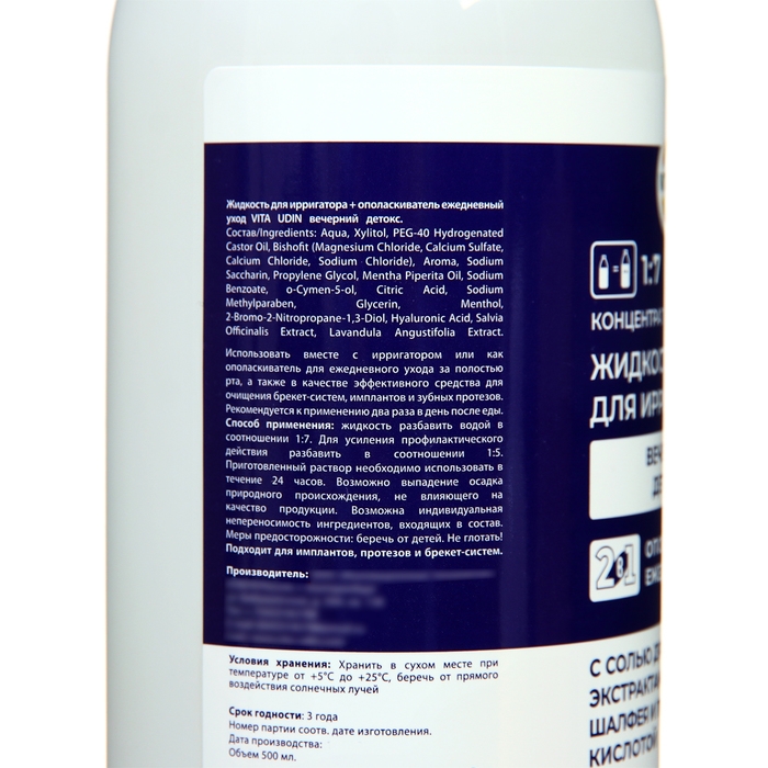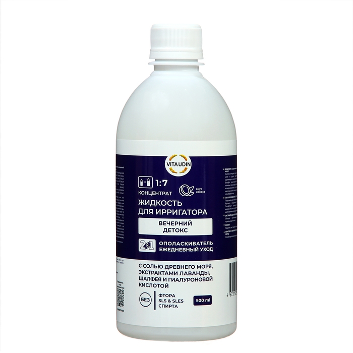 Жидкость для ирригатора Vita Udin "Вечерний детокс" - это специальное средство для ухода за полостью рта. Она содержит натуральные экстракты растений, которые помогают очистить зубы от налета и освежить дыхание.