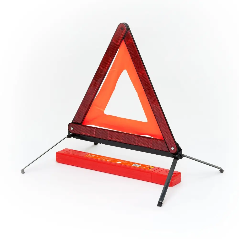 Знак аварийной остановки, представляет собой равносторонний треугольник. Внешняя сторона этого треугольника обклеивается полосой, изготовленной из светоотражающего материала. Это необходимо для того, чтобы он был заметен другим водителям с дальнего расстояния. Внутренняя сторона обклеивается флуоресцирующей яркой полосой. Соответствует ТР ТС 018/2011.