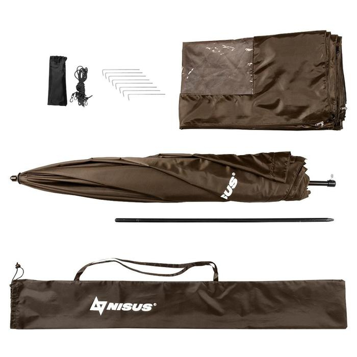 Универсальный зонт из высокопрочного материала Oxford 210D защитит от солнца и укроет при необходимости от ветра и моросящего дождя, благодаря тенту, который пристегивается на молнию по всему периметру. Для сохранения бокового обзора в рыболовном зонте на пристегиваемом тенте-стенке предусмотрены прозрачные окна. Отлично подойдет для установки на рыболовную платформу (фидерная и карповая ловля). Также будет полезным снаряжением на отдыхе на природе, можно использовать в качестве тента для хранения экипировки.