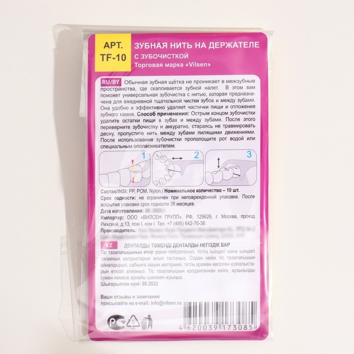 Зубная нить на держателе с зубочисткой Vilsen, 10 шт
