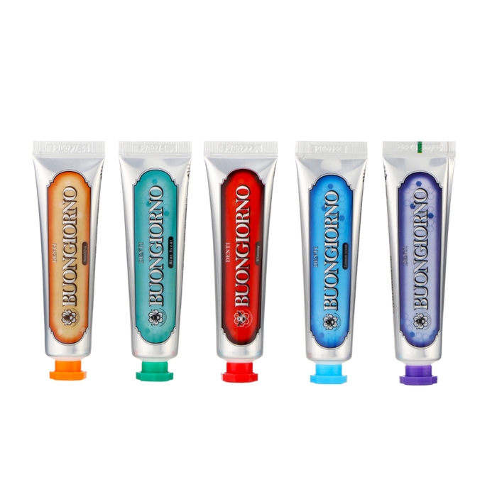 Зубная паста BUONGIORNO Gift Set — это набор из пяти мини-тюбиков с разными вкусами, идеальный выбор для разнообразия и свежести дыхания. В наборе представлены следующие вкусы: бразильский прополис и ромашка, мята и эвкалипт, корсиканская мята, перечная мята и сицилийский лимон и эвкалипт.