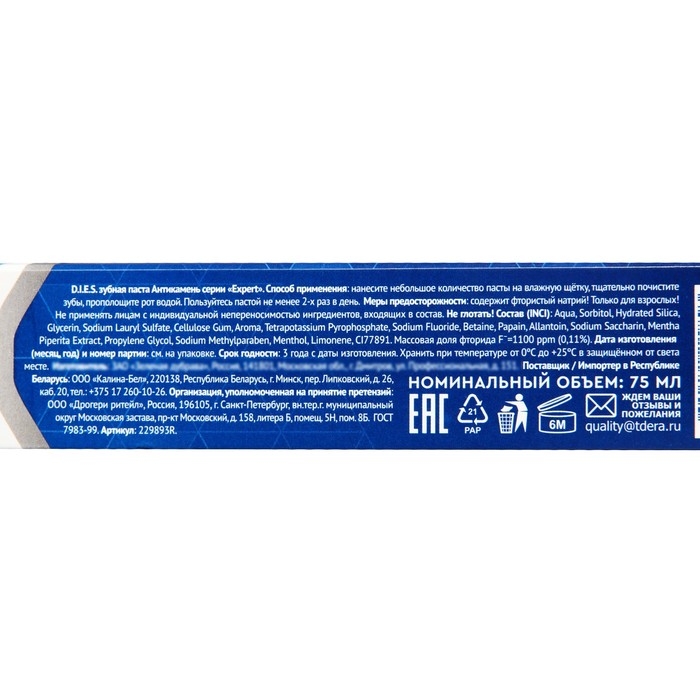 Зубная паста D.I.E.S. "Антикамень" - это эффективное средство для ухода за полостью рта. Упакована в тубу объемом 75 мл.