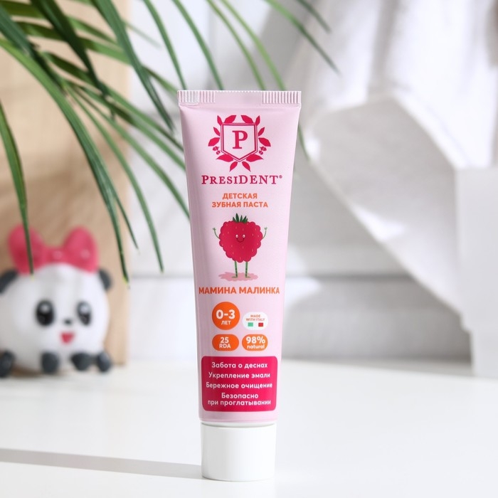 Зубная паста детская President "Малина" предназначена для детей в возрасте от 0 до 3 лет. Она имеет приятный вкус малины, что может сделать процесс чистки зубов более привлекательным для малышей.