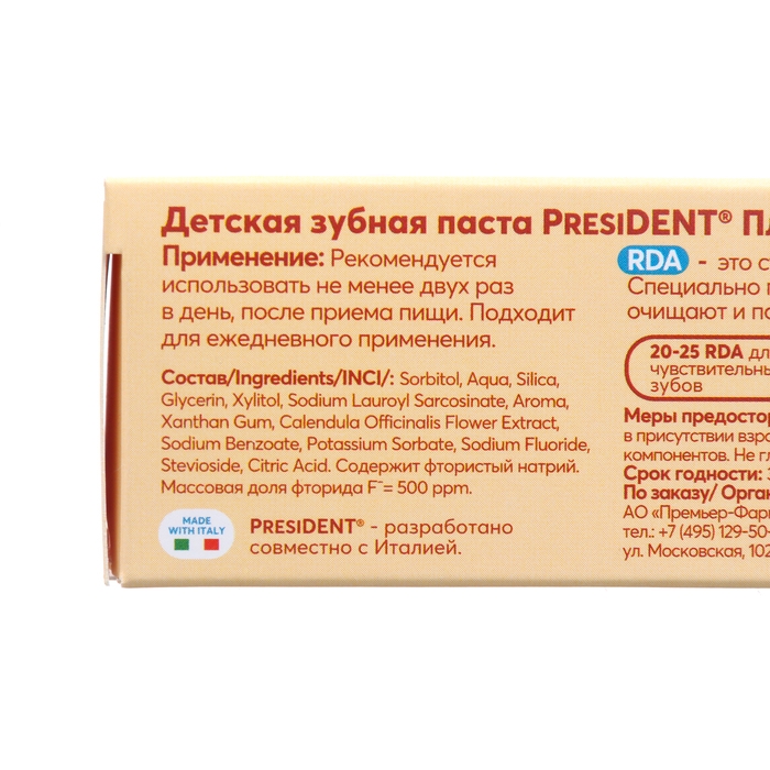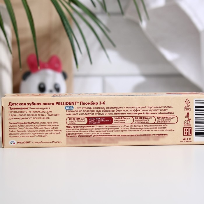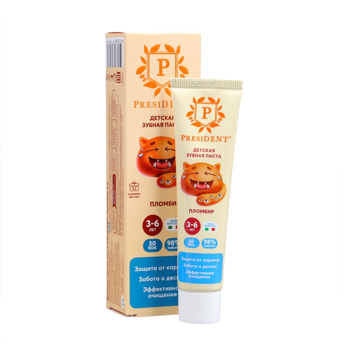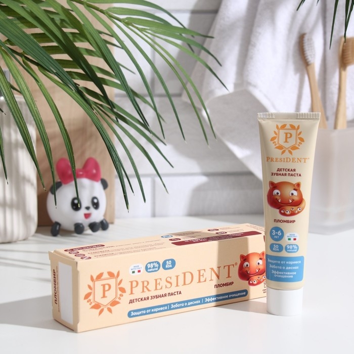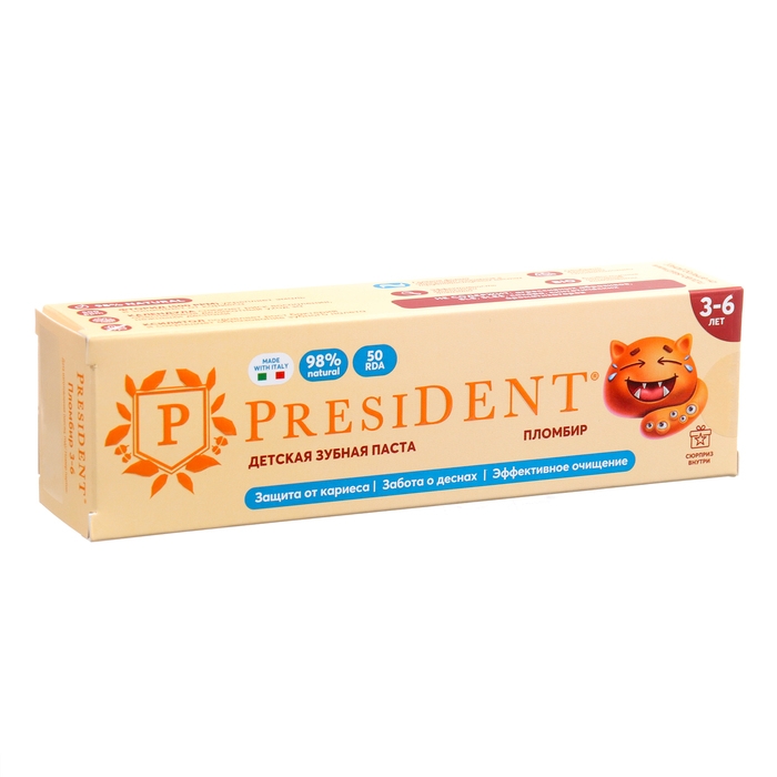Детская зубная паста PRESIDENT со вкусом пломбира от 3 до 6 лет на 98% состоит из натуральных компонентов и обеспечивает длительный и эффективный уход за молочными и постоянными зубами, предотвращает развитие кариеса, заботится о здоровье нежных десен.