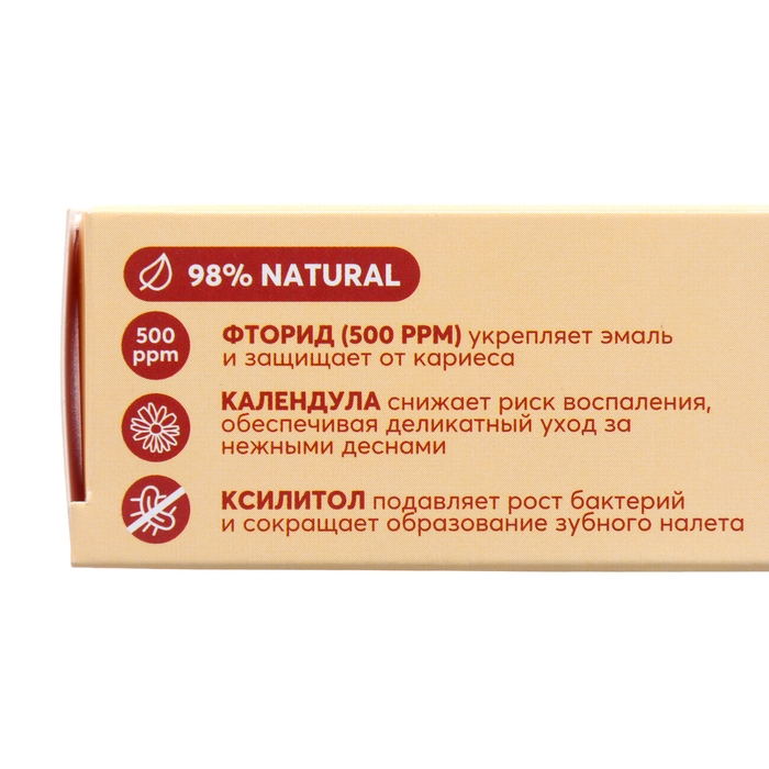 Зубная паста содержит фторид (500 ppm), который укрепляет эмаль и защищает от кариеса. Календула снижает риск воспаления.