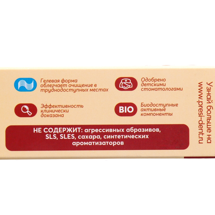 Детская зубная паста не содержит: Фторидов, агрессивных абразивов, SLS, SLES, сахара, синтетических красителей и ароматизаторов.